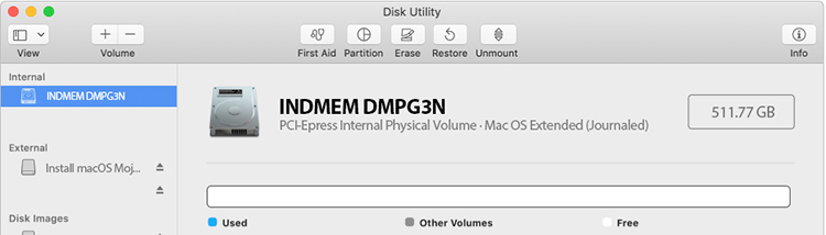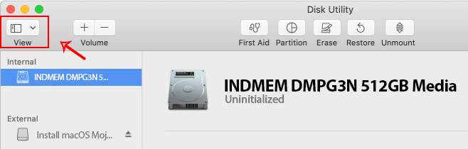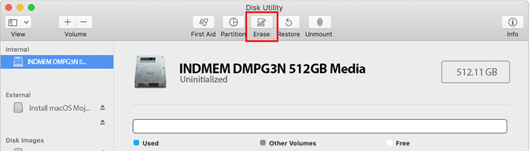 On "Disk Utility", click "View", select "Show All Devices", choose "INDMEM DMPG3N xxx", click "Erase".