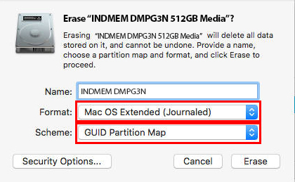Select “Mac OS Extended (Journaled)” as Format and “GUID Partition Map” as Scheme.