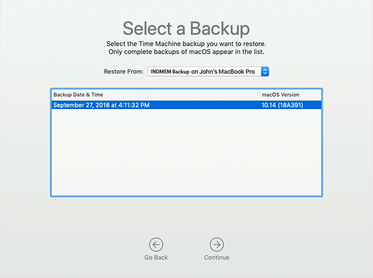 Select "Restore From Time Machine Backup" and click on “Continue”.