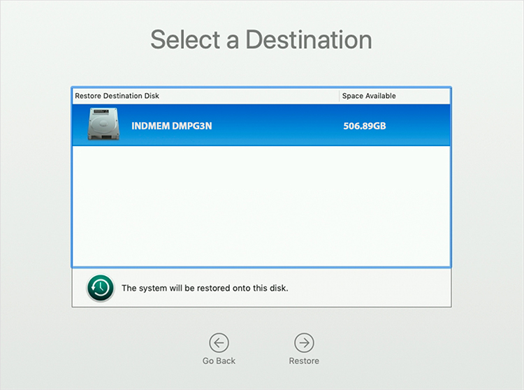 Choose the Destination (INDMEM DMPG3N) Disk and click on "Restore".