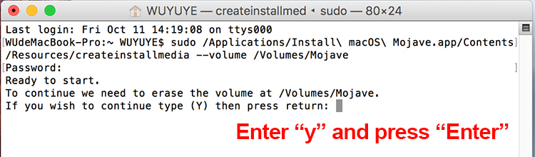 sudo /Applications/Install\ macOS\ Mojave.app/Contents/Resources/createinstallmedia --volume /Volumes/MyVolume