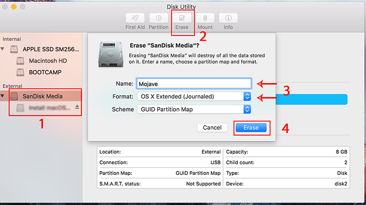 "Mojave". Format type select "OS X Extended (Journaled)", Scheme type select "GUID Partition Map.