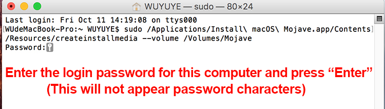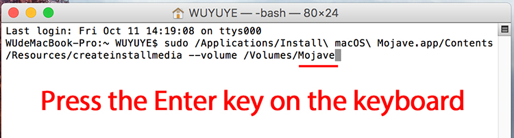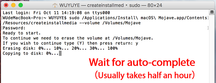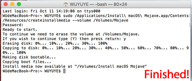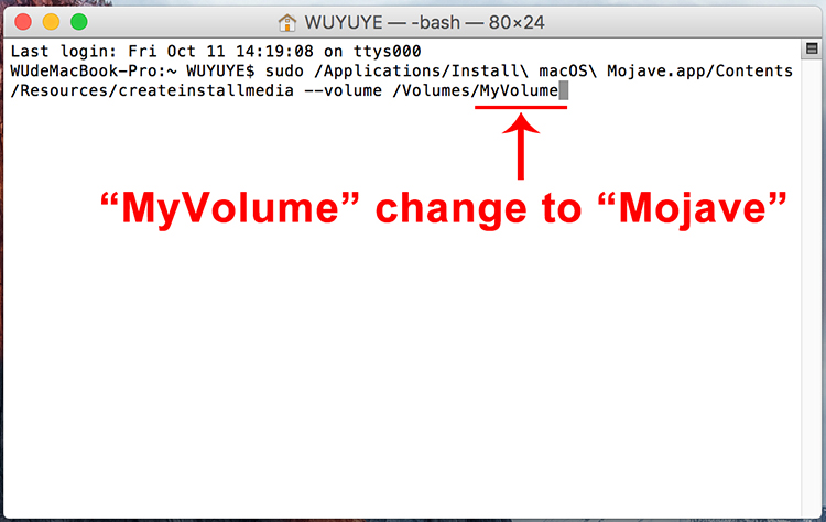 sudo /Applications/Install\ macOS\ Mojave.app/Contents/Resources/createinstallmedia --volume /Volumes/MyVolume