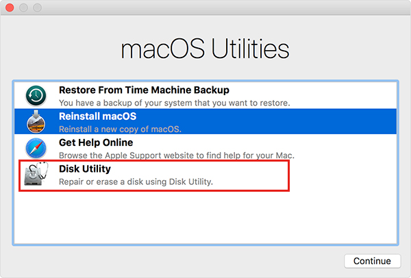On macOS Utilities, select "Disk Utility", click "Continue"