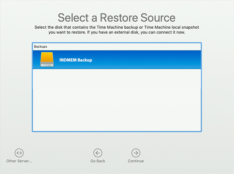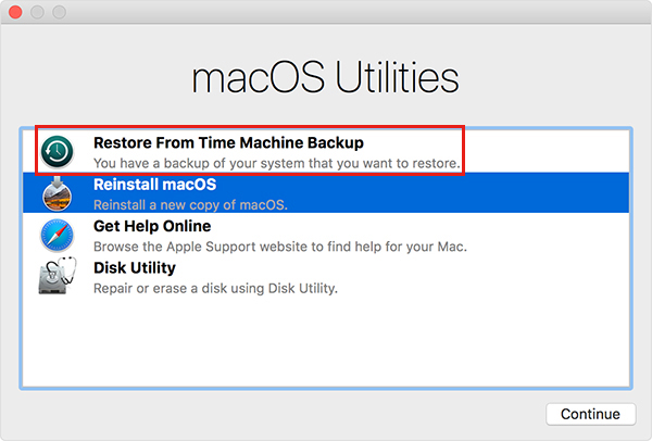 Select "Restore From Time Machine Backup" and click on “Continue”.