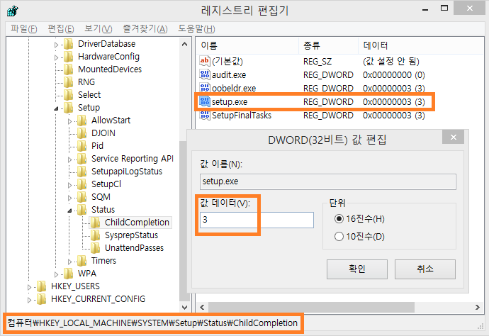 3. Find this directory, "HKEY_LOCAL_MACHINE\SYSTEM\Setup\Status\ChildCompletion"